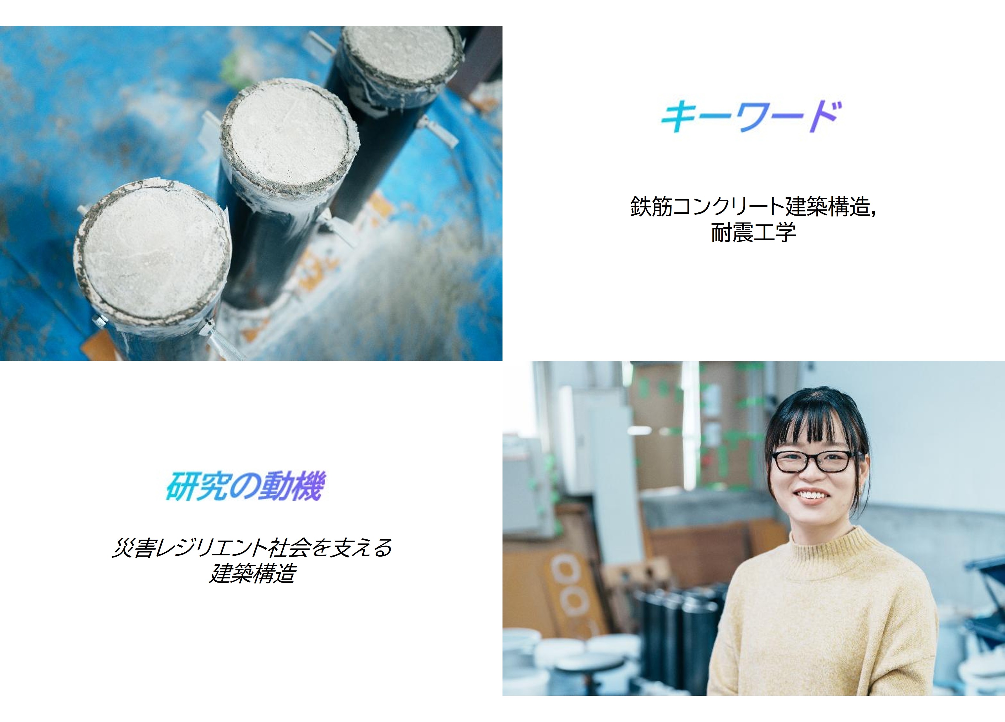 神奈川県出身。2015年、大阪大学工学部地球総合工学科を卒業。同大学大学院工学研究科に進学。修士課程を修了し2017年にニュージーランド オークランド大学に進む。2022年に博士号を取得。帰国後、大阪大学大学院で2年半助教を務め、2025年に広島大学大学院 先進理工系科学研究科の准教授に着任。専門は鉄筋コンクリート構造、建築構造、耐震工学。