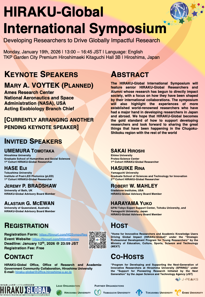 HIRAKU-Global国際シンポジウム2025では、世界にインパクトを与え始めているHIRAKU-Globalのシニアフェローが登壇する。彼らが、国際共同研究によってどのような影響を受けてきたかに注目していただきたい。さらに、基調講演者として世界的に顕著な研究実績があり、国内外で研究者育成に豊富な実績を持つ研究者を招聘する。中国・四国地方で進んでいるHIRAKU-Globalの研究者育成支援の実績を、世界に発信する。