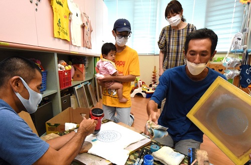 感染症予防のため、普段はきょうだいでも病棟には入れません。この日は、事前に体温を測り、医師の問診を受けたら、特別に入れるようにしました。藍染めの教室やクラフト作りのワークショップを開いている三原市の池上智樹さん、幸代さん夫妻と仲間の、合わせて7人が手ほどきをしてくれました。フォトフレームは木枠に毛糸やシール、松ぼっくりなどで飾り付けて仕上げ、Tシャツは、カメやクジラなどのデザインを選びシルクスクリーンで染めました。