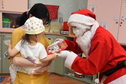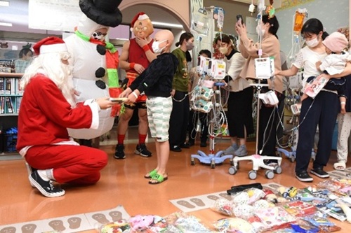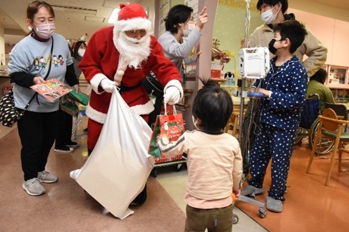 NPO法人チャリティーサンタ広島支部(広島市佐伯区)のサンタ平田富樹さんは23日、入院中の子どもたち40人に本やお菓子をプレゼントしてくださいました。