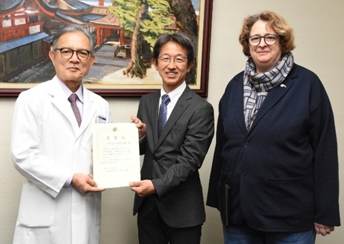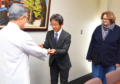 YMCA国際幼児園の田中信也園長とキャロライン・ロイド副園長が来訪されました。田中園長は広島大学病院の安達伸生病院長に目録を手渡し、「園児と同じような年ごろの子が病気で苦しんでおられます。保護者の方の気持ちも少しでも楽になれば」と話されました。安達病院長は感謝状を贈り、「今後も機会があればぜひお願いします」とお礼を述べました。YMCA国際幼児園は2003年の開園以来、クリスマス献金を病院や障害児の支援団体などに贈っています。