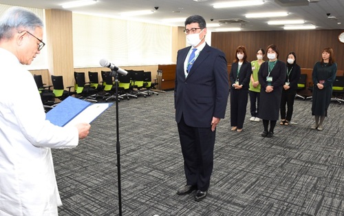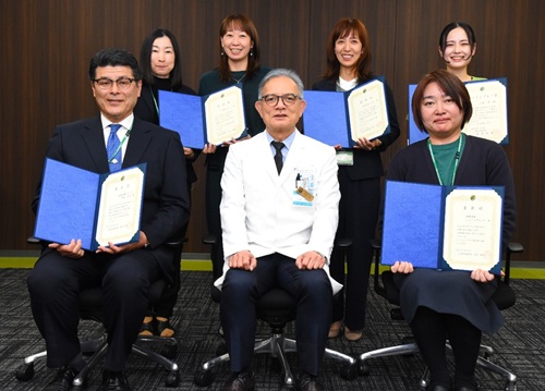 本院の医療サービス向上や発展に貢献した1人と3グループに、安達伸生病院長から3月16日、表彰状が授与されました。表彰は今回で29回目。また、重大インシデントになりえた事案を未然に防いだ「ファインプレー賞」は1人が選ばれました。表彰式では安達病院長が「皆様のおかげで安全安心な診療体制を構築できました。引き続きご貢献をお願いします」とねぎらいました。
