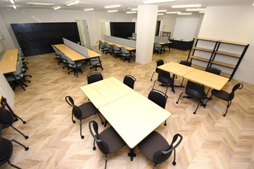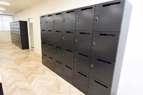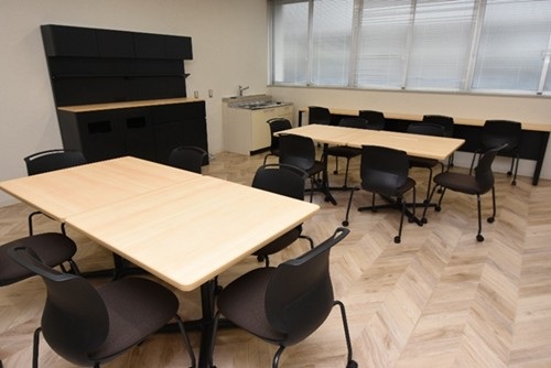 新しい控室は臨床管理棟内に設けられ、2人掛けの机が14台並ぶ広々とした空間となっています。壁際には大容量の個人用レターボックスを56台設置し、カフェテーブルや流し台、電子レンジ、湯沸かしポット、冷蔵庫などを備えたカフェスペースも整えました。隣室には男女別のロッカーを設置し、着替えや私物の管理にも配慮しています。無線LANを完備し、プレゼンテーションの練習や症例検討、勉強会などに活用できるスクリーンや電子カルテ端末も整備しました。さらに、超音波診断装置(エコー)や縫合キットを配置し、日常的に手技のトレーニングが行える環境も整えています。入室には職員証を用い、電子カルテへのアクセスには二要素認証を採用するなど、セキュリティにも十分配慮しています。