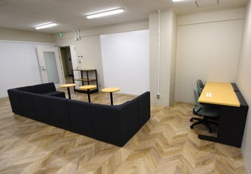 手前はカフェテーブル、後方にフリーアドレスのデスク