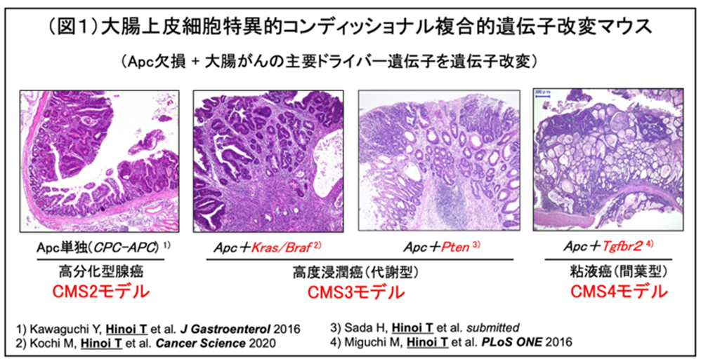 研究チームは、大腸がん関連遺伝子として腸上皮細胞の分化に関わるホメオボックス転写因子CDX2の研究を行う中、そのプロモーター領域(CDX2P-9.5kb)に、マウスの大腸上皮細胞(粘膜)特異的に転写活性を持つ領域を発見し、この配列を利用して世界で最初の自然発生による大腸浸潤がんマウスモデル(CPC-APCマウス)を確立しました(Hinoi T, Cancer Res 67:9721-30 2007)。