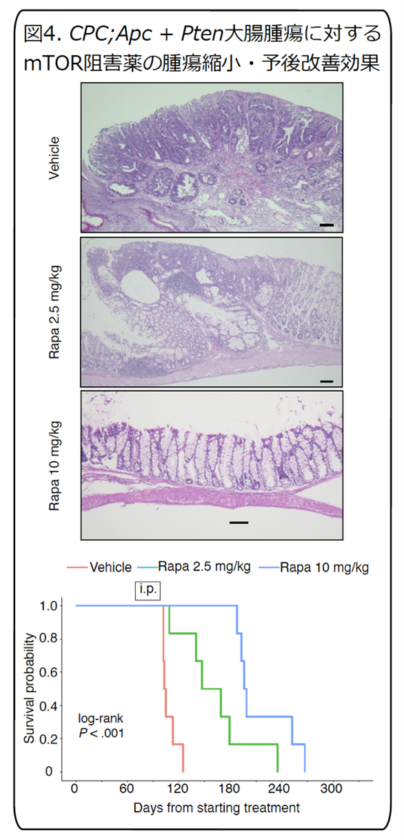 さらに、このマウスに特定のシグナル経路(PI3K-PTEN経路)を抑える薬剤(ラパマイシン)を投与したところ、腫瘍の発生が大きく抑えられることが確認されました。またヒトの大腸がんでも、良性の段階から悪性へ進む過程で同じ経路に関わる遺伝子異常が見つかり、この経路ががんの進行に重要であることが裏付けられました。