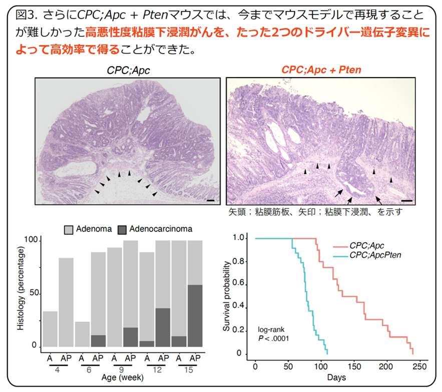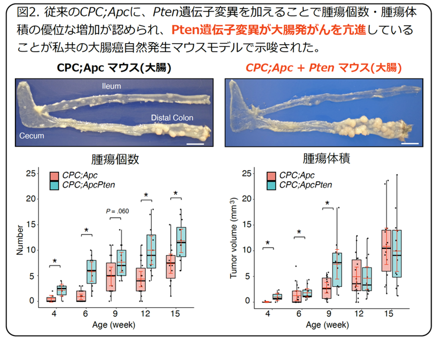 ■論文タイトル:Colon-restricted Pten haploinsufficiency models PI3K pathway-driven invasion in colorectal cancer (大腸限定型Ptenヘテロ欠損モデルは、大腸がんにおけるPI3Kシグナル伝達経路を介して浸潤を促進する)