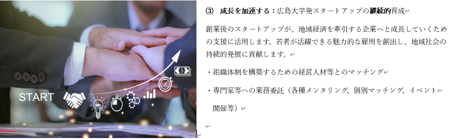 「広島大学スタートアップ事業化支援基金」は、広島の豊かな知的資産と技術を基盤とし、未来を担うスタートアップ企業の創出とその成長を一貫して支援するものです。私たちはこの基金を通じて、地域経済の持続的な活性化を推進し、若者が夢を描き、活躍できるイノベーションを地域に根付かせることを目指します。