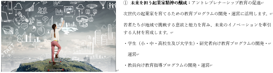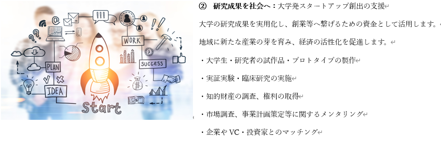 この基金は、イノベーションを生み出す次世代の起業家を育成すること、大学の研究成果を実用化し、スタートアップを創業するためにサポートすること、創業したスタートアップの更なる成長をサポートすること等に活用します。