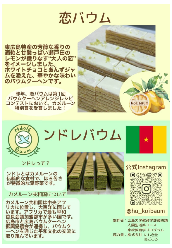 私たち「バウムクーヘン開発班」は9月16(火)日に大阪・関西万博にて行われる「大阪・関西万博カメルーン・ナショナルデー応援企画「カメルーン×広島市 バウムクーヘンがつなぐ平和文化」~世界でここだけ!「ンドレ」バウムクーヘンを食べて万博ジオラマづくりに参加しよう!~」に参加します!バウムクーヘン焼き体験など様々な内容が盛り込まれており、バウムクーヘンやカメルーンの魅力を知ることのできるイベントです。今回、私たちが開発したオリジナルバウムクーヘン「ンドレバウム」の試食(配布)も予定しています。