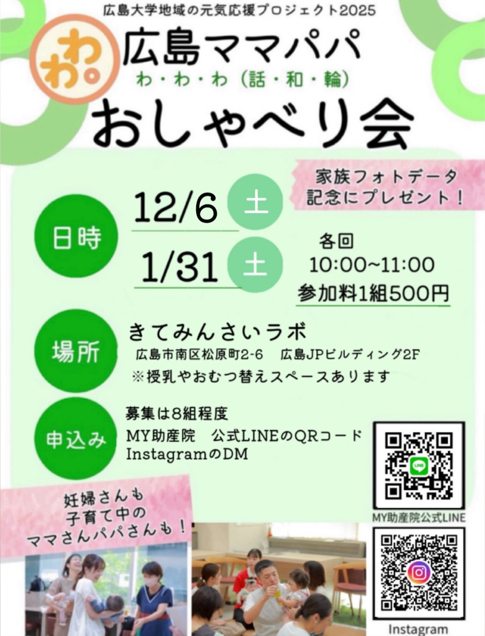 「広島ママのわ・わ・わ(話・和・輪)」は、2024年に広島大学医学部保健学科看護学専攻助産師教育課程の学生と教員、地域の開業助産師で結成しました。2025年度広島大学地域の元気応援プロジェクトによる「おしゃべり会でつなぐ地域ママの輪」を全6回開催します。