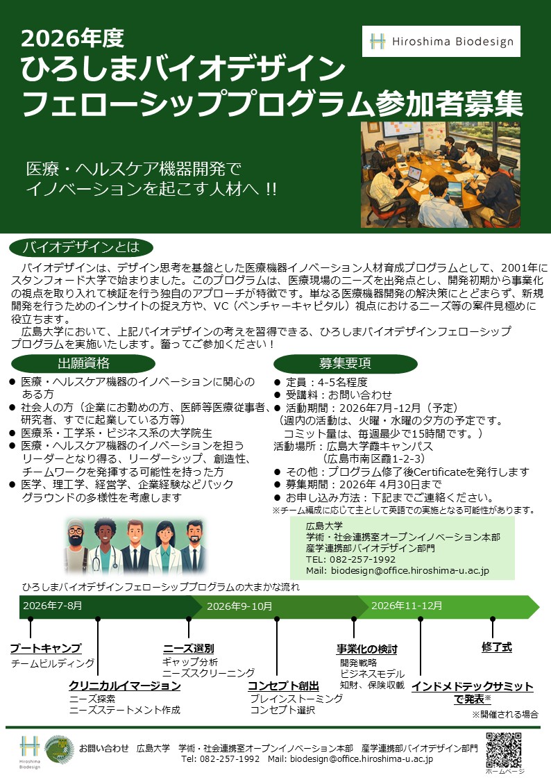 • 【お知らせ】2026年度ひろしまバイオデザインフェローシッププログラム参加者を募集します!