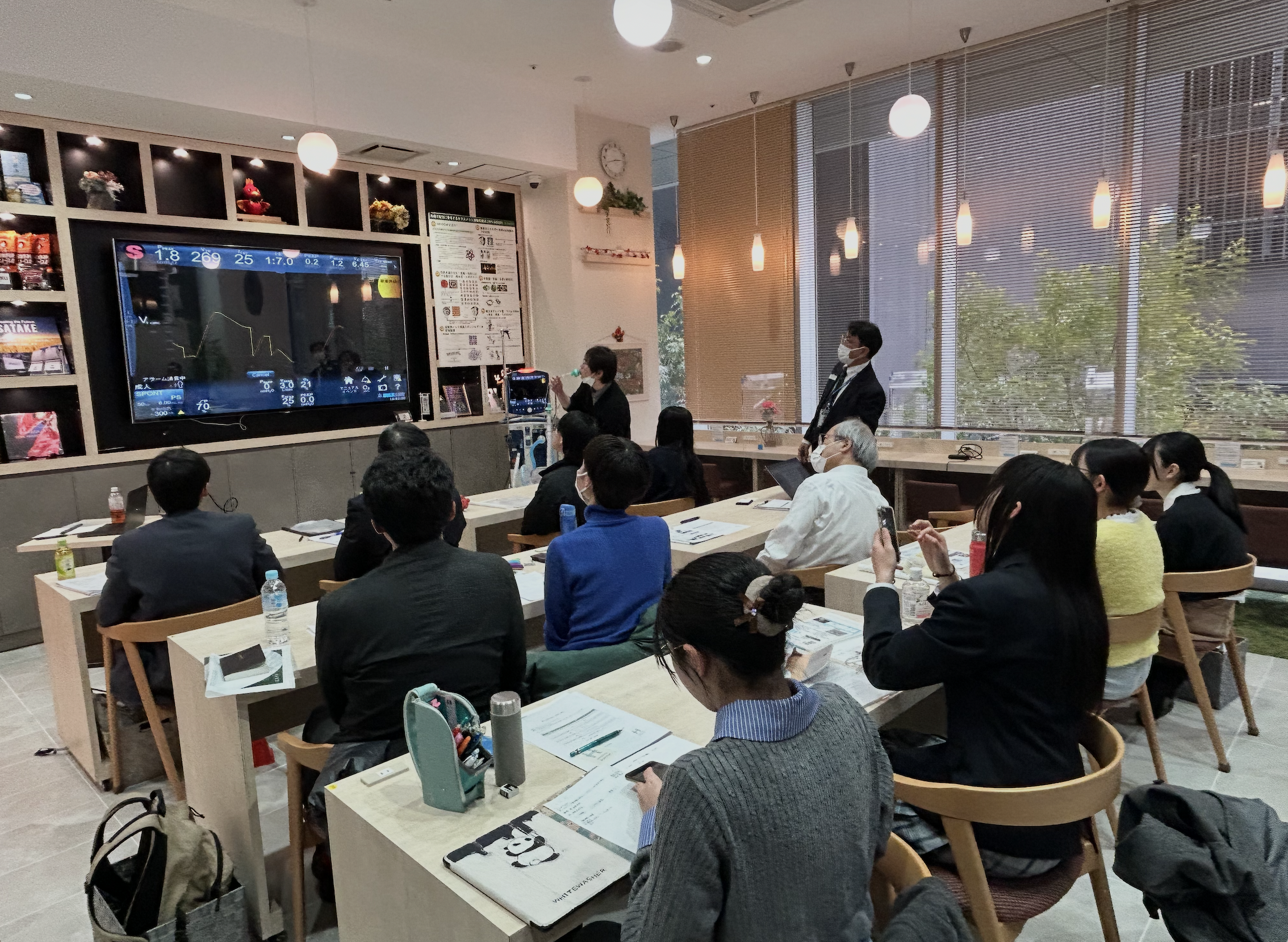 本サロンでは、「人工呼吸器の仕組みを知ろう!!」をテーマに、人の呼吸の仕組みや人の呼吸と人工呼吸の違い、人工呼吸器の役割などについて体験的に学ぶプログラムを実施しました。特に今回の特徴は、実際の臨床現場で使用される本物の人工呼吸器に直接触れ、操作を体験していただいた点です。参加者自身が人工呼吸器の設定や操作を行い、教科書や講義だけでは得られない実践的な理解を深めました。人工呼吸器の構造や安全機構、アラームの意味などについても解説し、医療機器が患者の安全を支える仕組みを一緒に学びました。