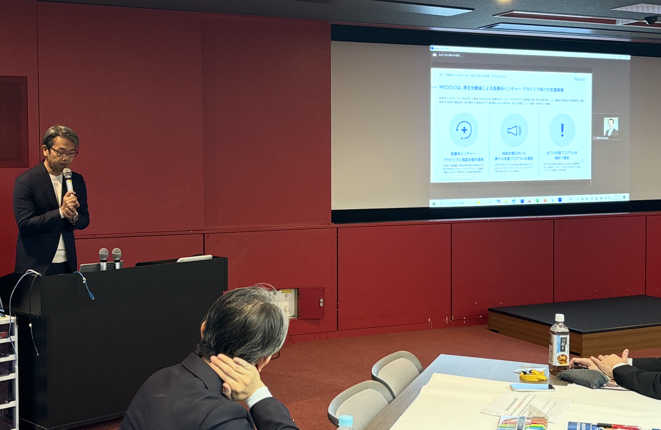 プログラムでは、川上先生より、MEDISOのこれまでの活動内容や、医療系ベンチャー支援の取り組みについてご紹介いただきました。続いて、曽山先生からは「MEDISO2.0」として今後のMEDISOの展望についてご紹介いただき、医療機器研究開発を取り巻くエコシステムのさらなる発展に向けた取り組みについてご説明いただきました。