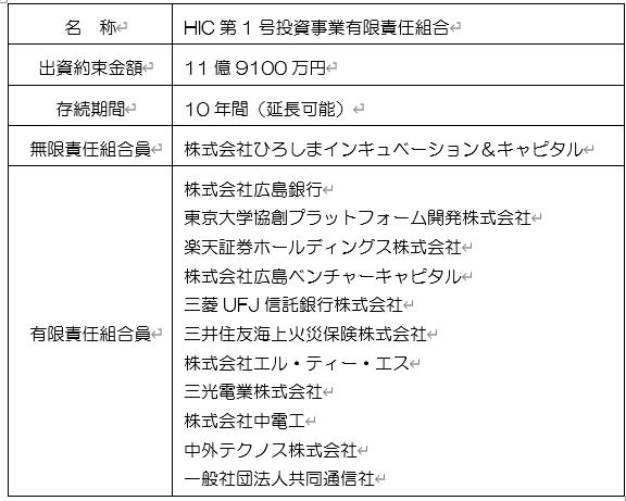 HIC第1号ファンドは、“大学発ベンチャーキャピタル”として、広島県内における大学主導型のベンチャーキャピタルとして組成したファンドです。地元の地方銀行を中心に、広島県内外の金融機関や事業会社からの出資を元に組成されている点が大きな特徴と言えます。