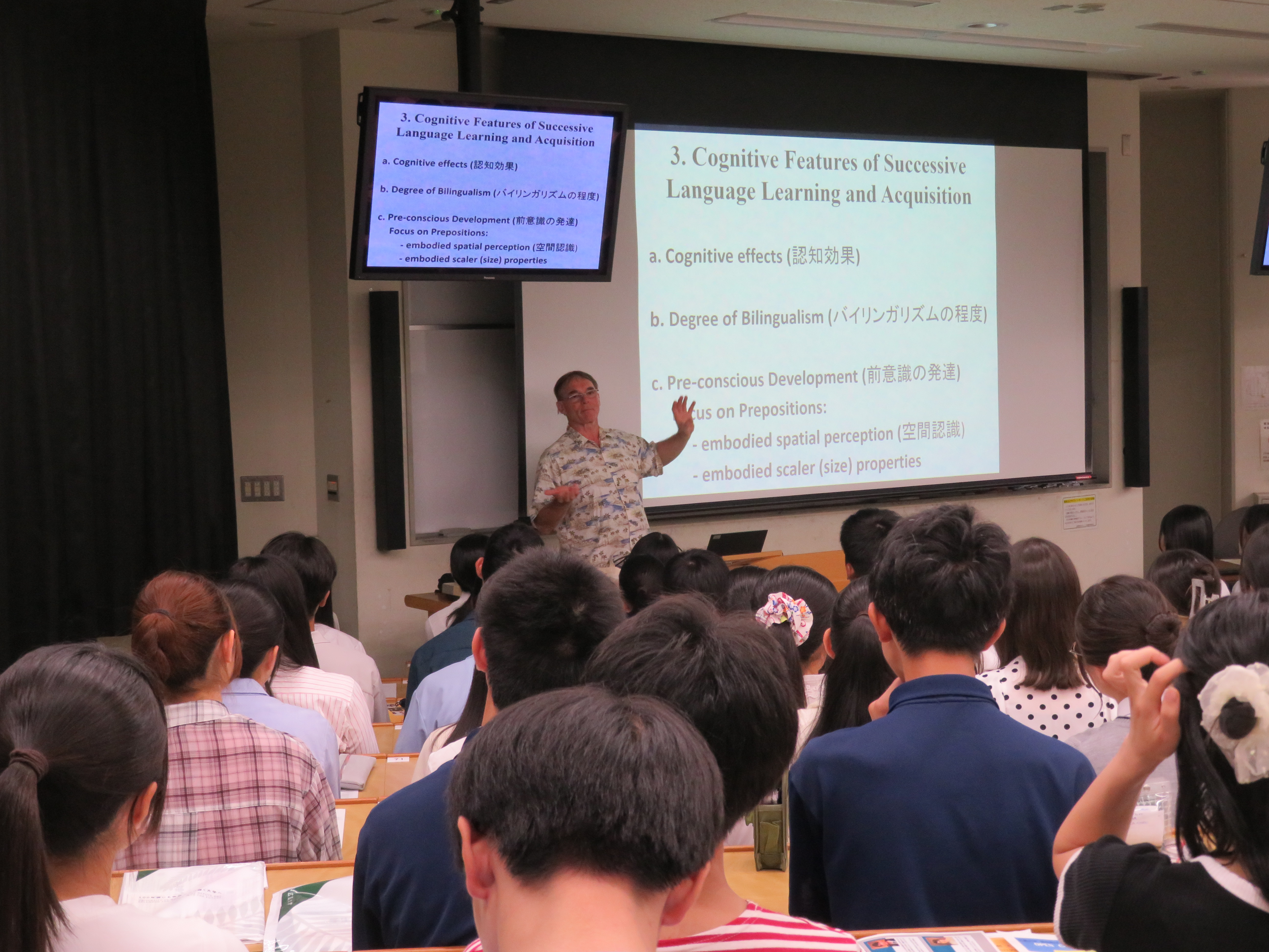 メイン会場では,にぎわいのある雰囲気の中、学部長挨拶に続き模擬授業、学生の体験談紹介が実施され、参加者に総合科学とは何かを感じていただきました。