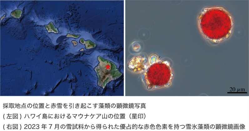 ハワイ島のマウナケア山(標高4,207メートル)は、熱帯に位置しながらも、冬季に降雪があることが知られています。太平洋中央部に位置し、最も近い大陸から約3,900キロメートル離れたハワイ島の雪に、雪氷藻類が繁殖して赤雪現象が起こるかどうかについては、今まで科学的確認例はありませんでした。