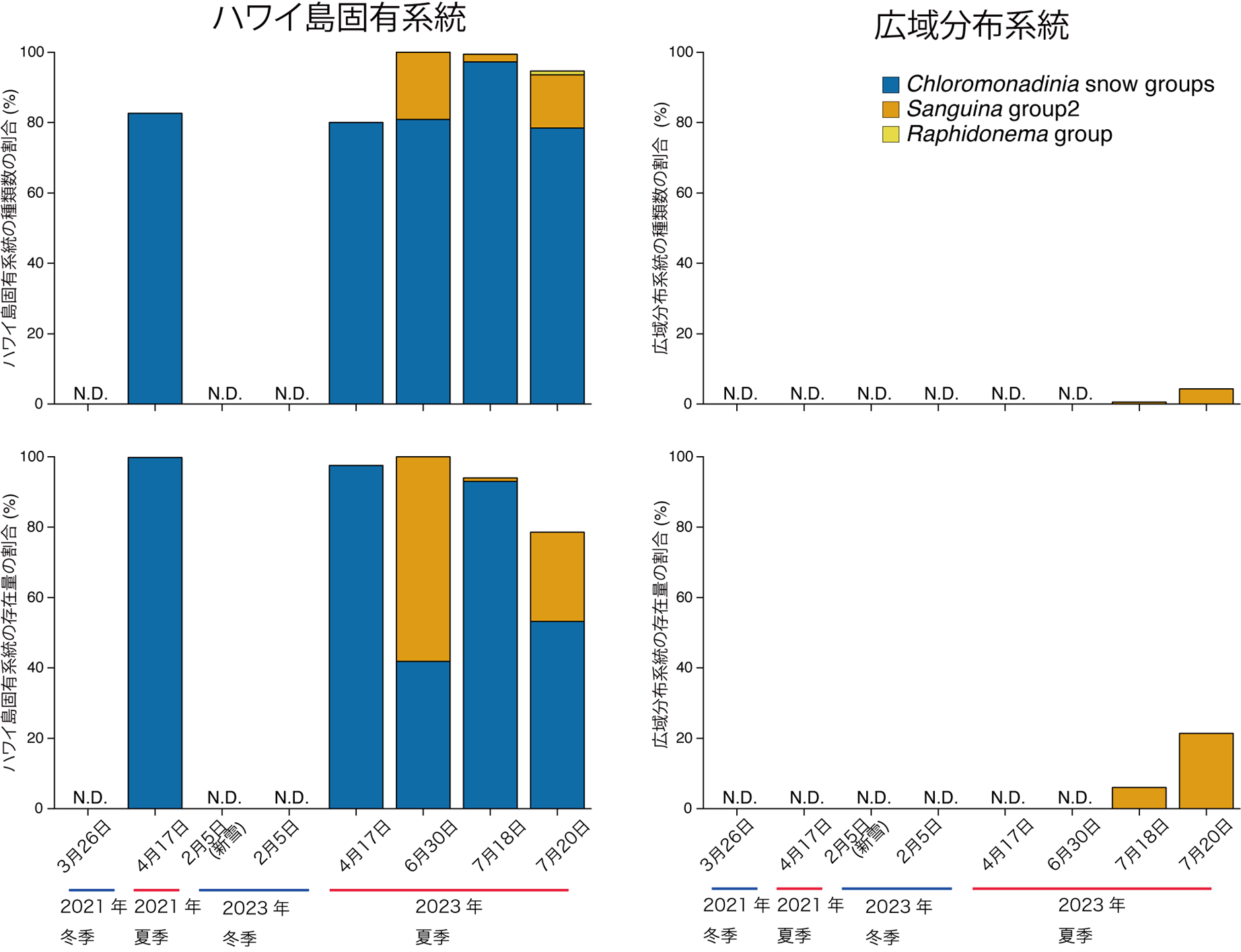 図3:ITS2配列に基づくマウナケア山の赤雪中のハワイ島固有系統および広域分布系統の割合