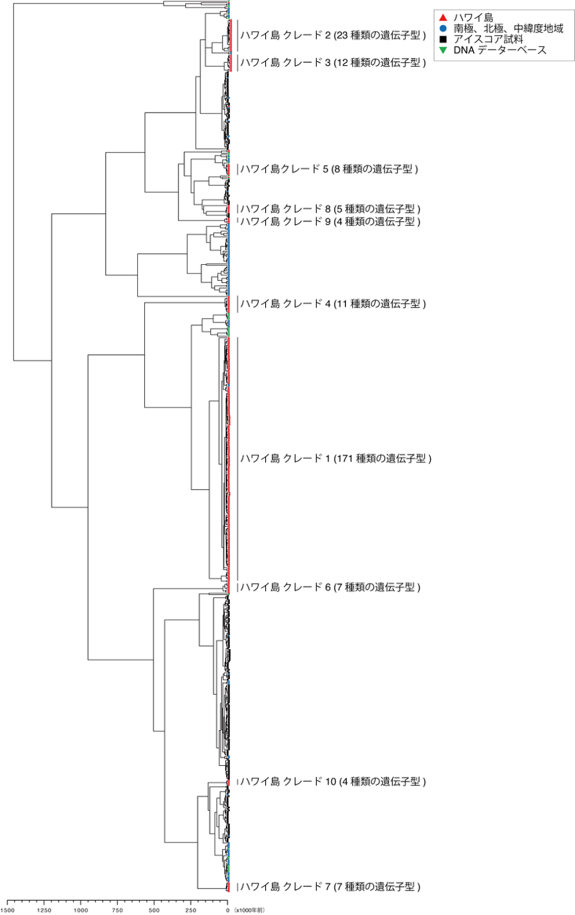 ITS2を用いた解析により、ハワイ島で発見された雪氷藻類(赤点)と世界各地の同グループ藻類がどの時期に共通祖先から分岐したかを推定。数値は分岐年代(年前)を示す。比較対象は南極・北極・中緯度地域の雪氷、中央アジアの氷河コア、および世界の遺伝子データベースから得られた同グループの藻類。