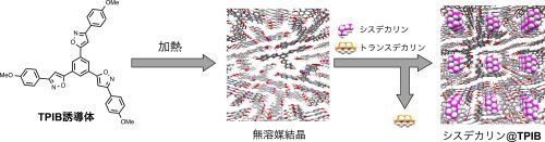 平面分子が結晶状態で分子間に形状の一義的に定義された空孔をつくり、その空孔の形状に適合する特定の分子のみを選択的に取り込むことを発見