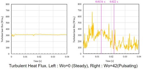 流動場の乱れ、曲り管のみで生じる曲り部での二次流れ・渦構造の時間変化が壁面熱伝達に影響し、曲り管の伝熱抑制・熱損失低減に繋がることが分かった。