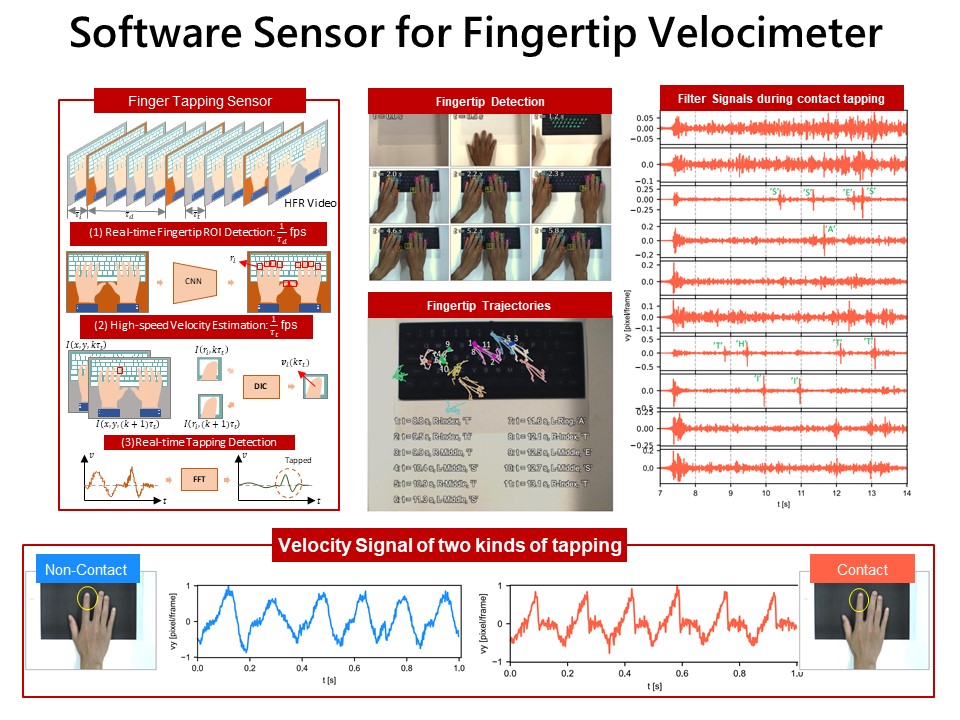 高速度カメラを使用した指先速度センサを用いて、指のタッピング時刻と位置をリアルタイムで正確に推定する技術を開発。