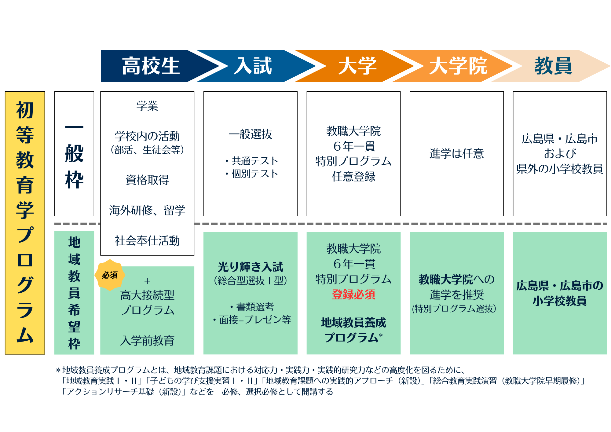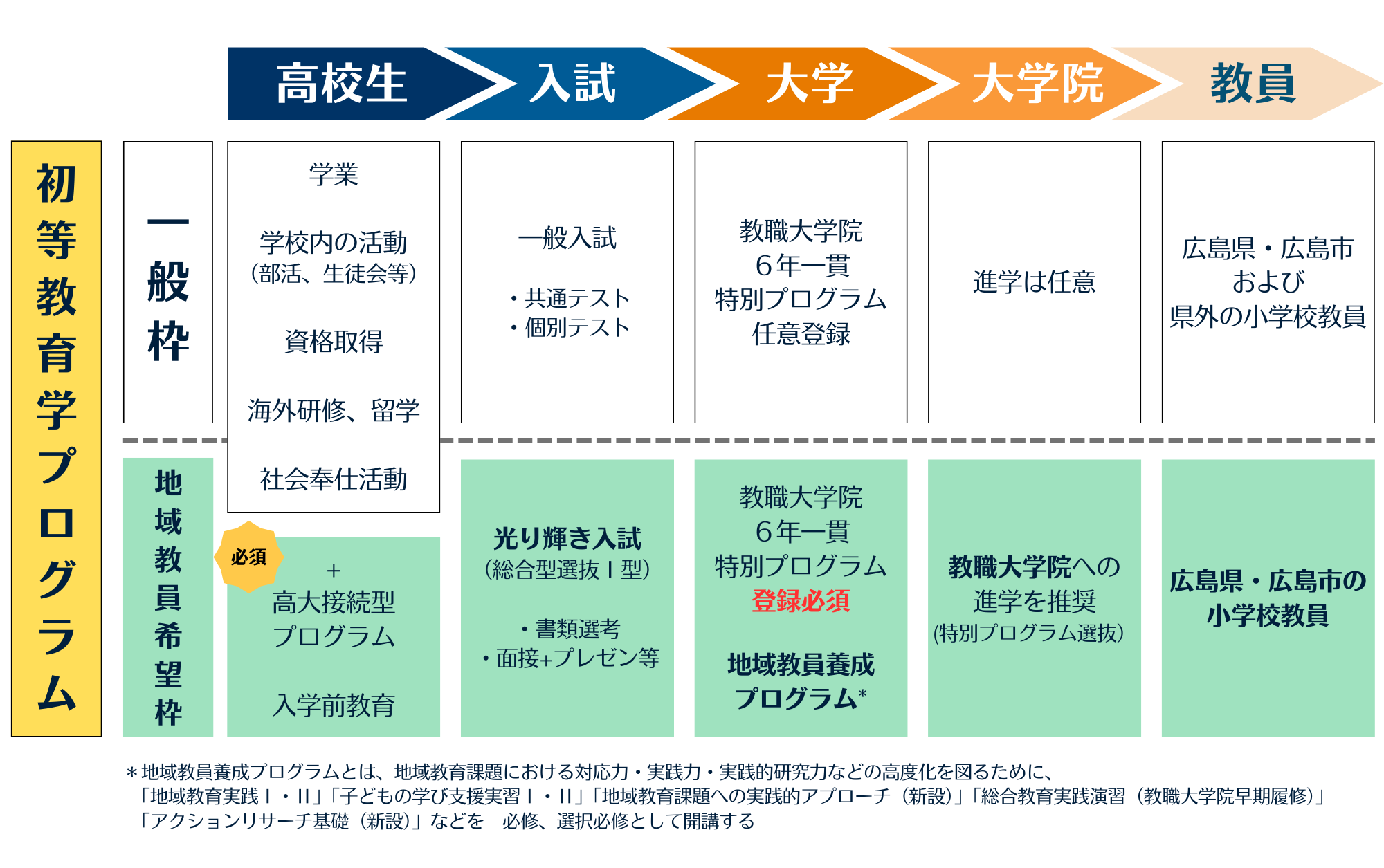 地域教員希望枠「育成型」入試とは、教育学部第一類(学校教育系)初等教育学プログラムにて令和9年度入試(令和8年度実施)から新たに実施する光り輝き入試・総合型選抜Ⅰ型(大学入学共通テストを課さない選抜)で、広島県内の小学校教員を目指す全国の高校生のための入試です。
