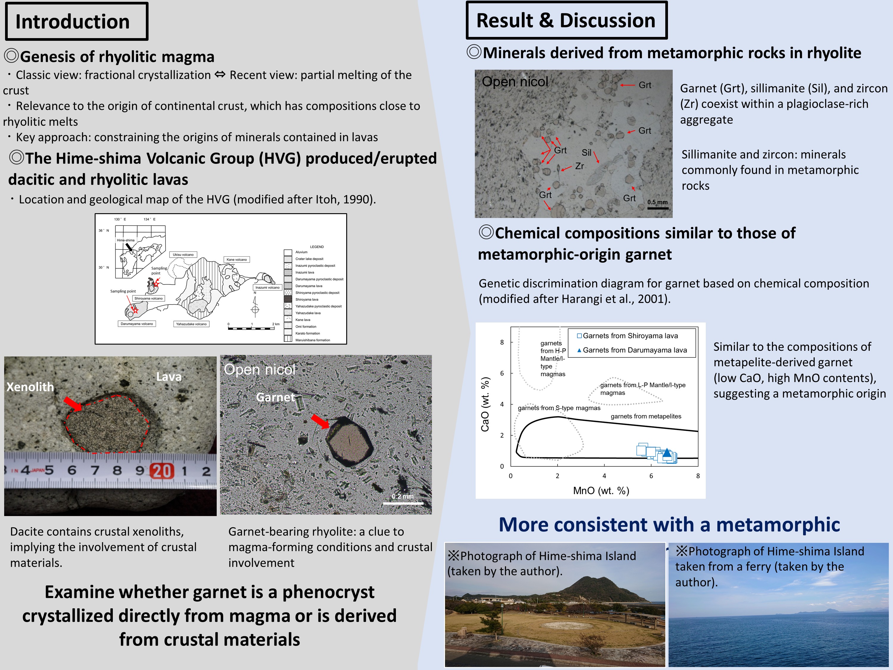 The coexistence of garnet with sillimanite and zircon (minerals commonly found in metamorphic rocks) in a plagioclase-rich mineral aggregate, together with the garnet’s high-MnO and low-CaO compositions, showed that the garnet is a metamorphic-derived xenocryst rather than a magmatic phenocryst.