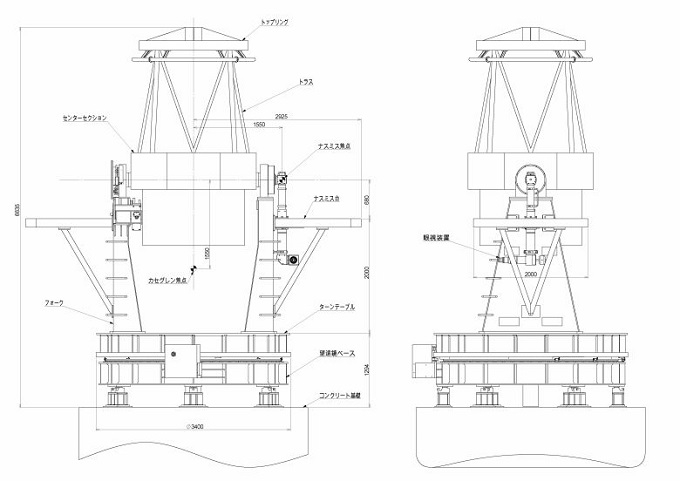 鏡筒(特にセンターセクションより下部)は簡易的に描かれています。詳細は下の赤外シミュレータの外観図を参考にしてください。なお、カセグレン・ローテータのフランジ面とターンテーブルの床との距離は、赤外シミュレータよりも20cmだけ長くなっています。