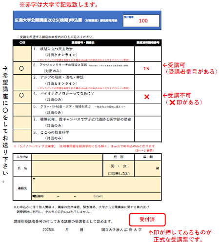 1.広島大学 学術・社会連携室 公開講座担当宛に次の①②を郵送してください。