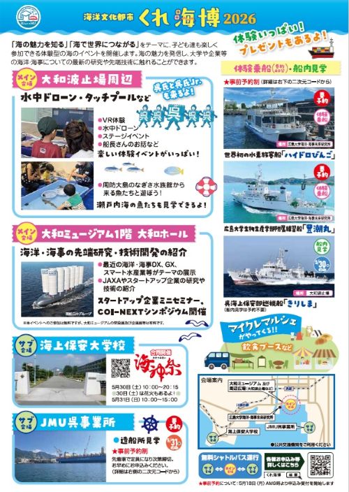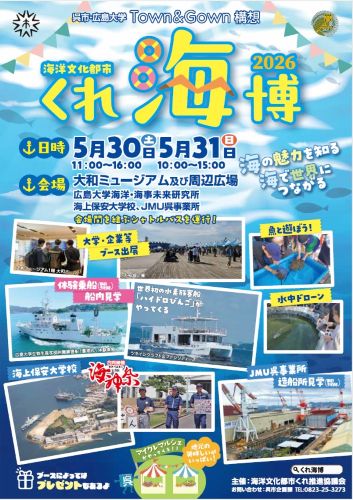 呉市・広島大学 Town & Gown 構想推進に向けた取組の一環として、今年は5月30日(土)、31日(日) の2日間、『海洋文化都市くれ海博2026』を開催します。
