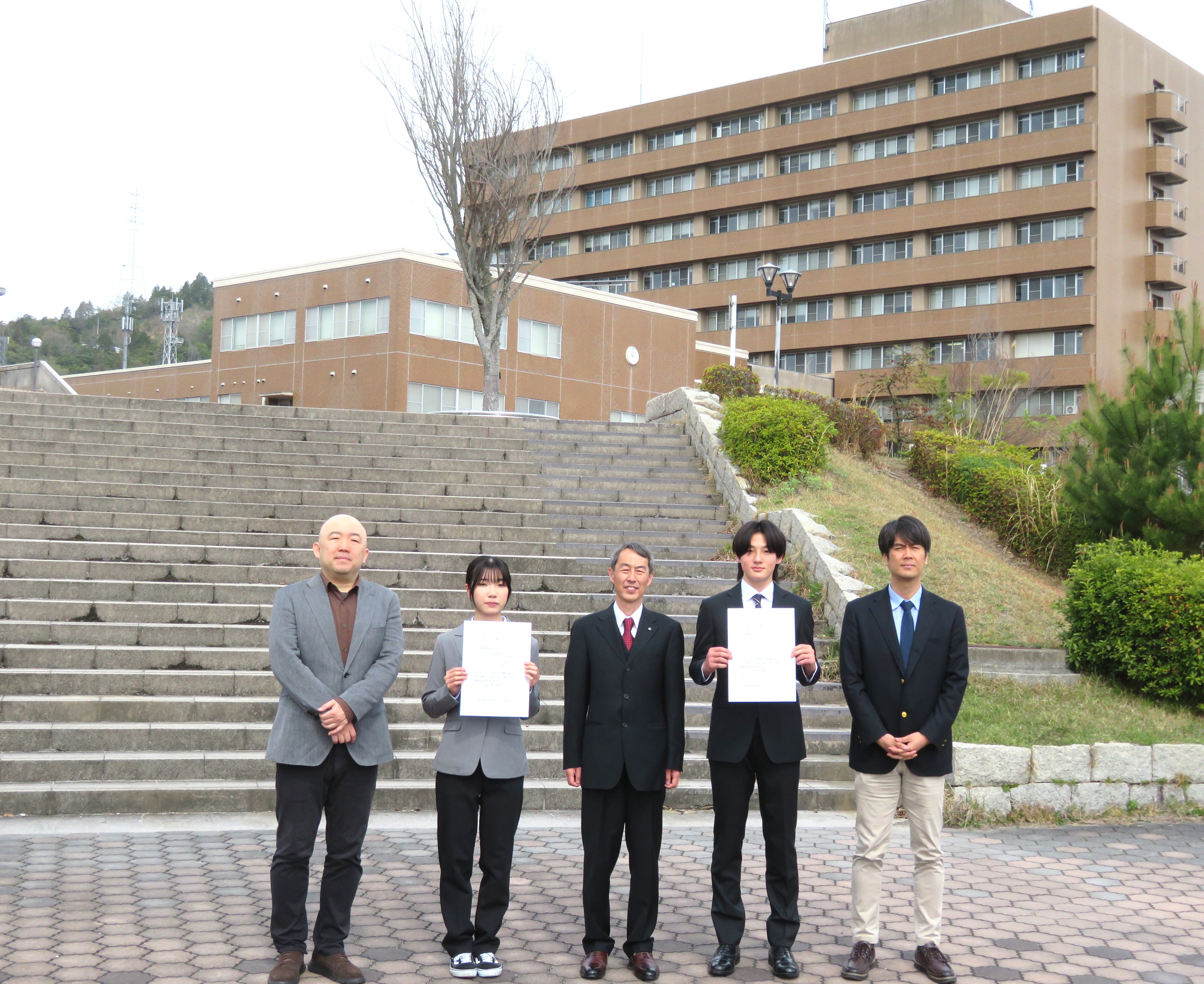 左から石原副学部長,酒井さん,山田学部長,川村さん,田中副学部長