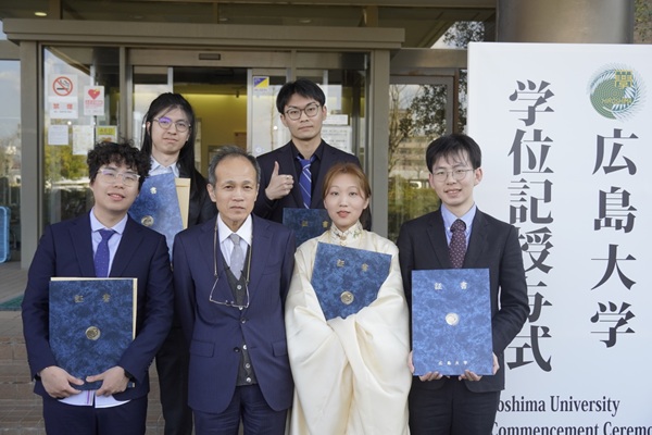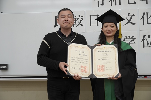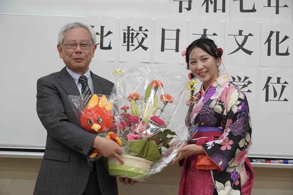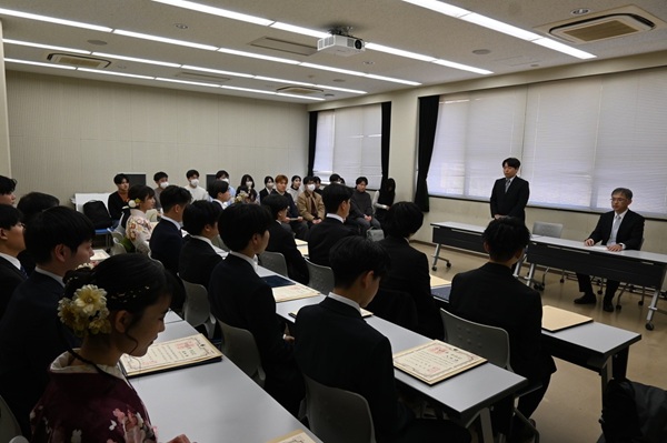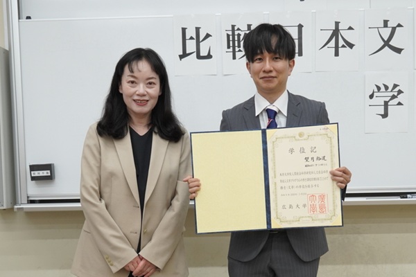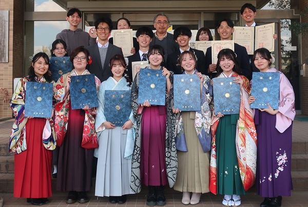 式典後、大学院人間社会科学研究科人文学プログラムを修了した博士課程前期の学生35名は、2年間研究に打ち込んだ学舎に戻り、指導教員等から一人ひとり学位記を受け取りました。また、博士課程後期を修了した学生7名は、式典の場で学長より直接学位記を授与された後、旅立ちのあいさつとして恩師や研究室の後輩たちを訪ね、和やかな時間を過ごしました。