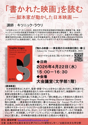 広島大学比較日本文化学プロジェクト研究センターでは、キツニック・ラウリ氏(ヴェネツィア大学アジア・北アフリカ研究学科准教授)を講師にお招きし、以下のとおり講演会を開催します。