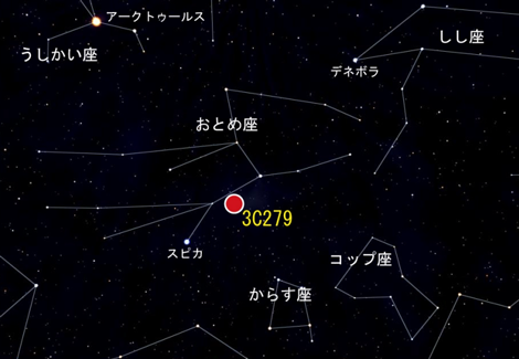 今回、広島大学宇宙科学センターを含む国際共同研究グループは、「3C279」と呼ばれる活動銀河をフェルミ・ガンマ線宇宙望遠鏡のガンマ線観測と同期したキャンペーン観測を提案し、X線衛星を含む多くの望遠鏡が参加しました。広島大学では「かなた望遠鏡」に3色同時分光偏光撮像装置(名古屋大学開発)を付けた同時観測を5ヶ月連続で行いました。「3C279」は我々から53億光年の非常に遠い距離にありながら明るく輝く(ガンマ線では我々の銀河の1億倍の光度)活動銀河で、ブラックホールからのジェットを正面から見ていると考えられている天体です。
