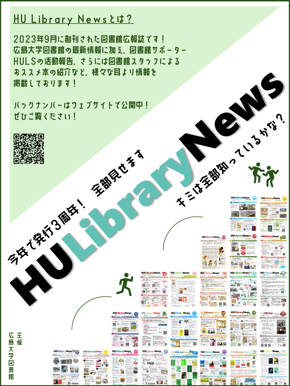 2023年9月に創刊されたHU Library Newsを、創刊から現在までを一覧として展示いたします。近年の広島大学図書館の動向もわかる展示となっておりますので、ぜひご覧ください。
