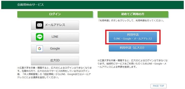 1.ページ最下部の【会員用WEBサービス】のバナーから、初めてご利用の方「利用申請(LINE・Google・メールアドレス)」をクリックしてください。