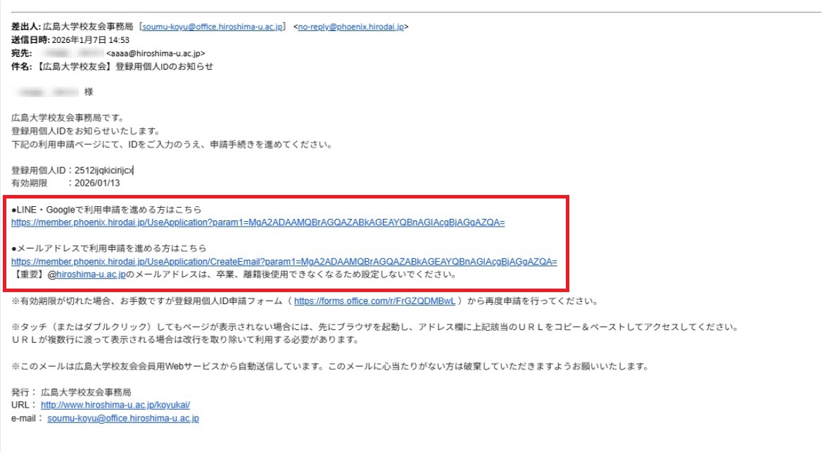 3.申請受付後、広島大学校友会事務局から送られる「【広島大学校友会】登録用個人IDのお知らせ」メールを開き、SNS(LINE,Google)またはメールアドレスの「利用申請を進める方はこちら」から申請手続きを進めてください。