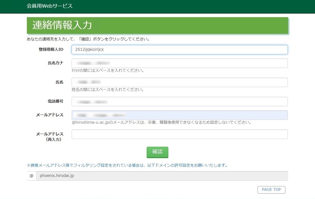 連絡情報を入力して、「確認」ボタンをクリックしてください。