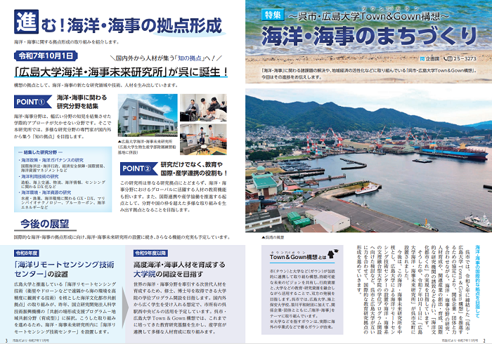 呉市が毎月10日に発行する「市政だよりくれ」11月号で、呉市とのTown & Gown構想の一環として令和7年10月1日に呉市に開所した、広島大学海洋・海事未来研究所(本学生物生産学部附属練習船基地に併設)の今後の取り組みや展望、これまでのTown & Gown構想の歩みなどが紹介されました。