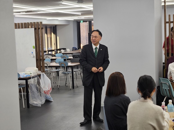 吉中法学部長からのご挨拶の後,参加者はみんなで一緒にお菓子を食べながら,楽しい時間を過ごして交流を深めました。