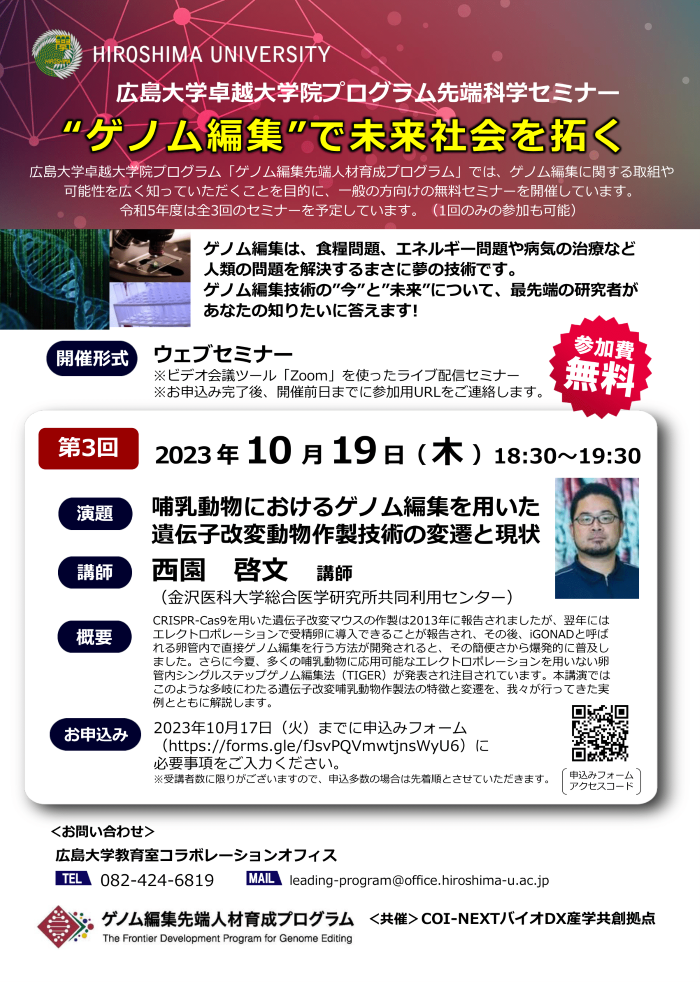 【2023/10/19開催・オンライン・要申込】広島大学卓越大学院プログラム先端科学セミナー「哺乳動物におけるゲノム編集を用いた遺伝子改変動物作製技術の変遷と現状」を開催します