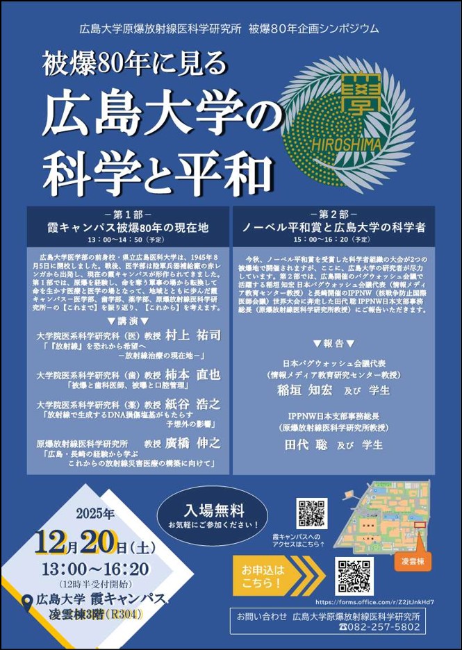 • 【2025/12/20開催・霞・要申込】広島大学原爆放射線医科学研究所 被爆80年企画シンポジウムを開催します