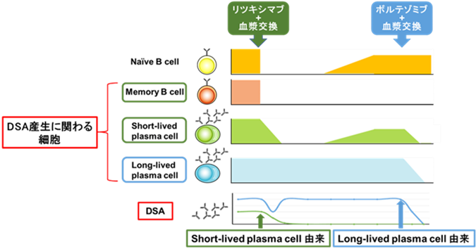 DSA産生に関わる細胞にはmemory B細胞,short-lived およびlong-lived plasma cellがあり,それぞれを制御する必要がある。リツキシマブは,memory B細胞、short-lived plasma cellに対しては有効であるので、DSAがshort-lived plasma cell由来であればリツキシマブのみで脱感作は可能となる。しかしlong-lived plasma cellに対しては無効であるので、さらにボルテゾミブの投与が必要となる。この際、リツキシマブとボルテゾミブを同時に投与すると過度の免疫抑制状態に陥る危険性があるため,リツキシマブ投与後に一旦消失した成熟B細胞が回復し、memory B細胞が回復する前にボルテゾミブを投与する。