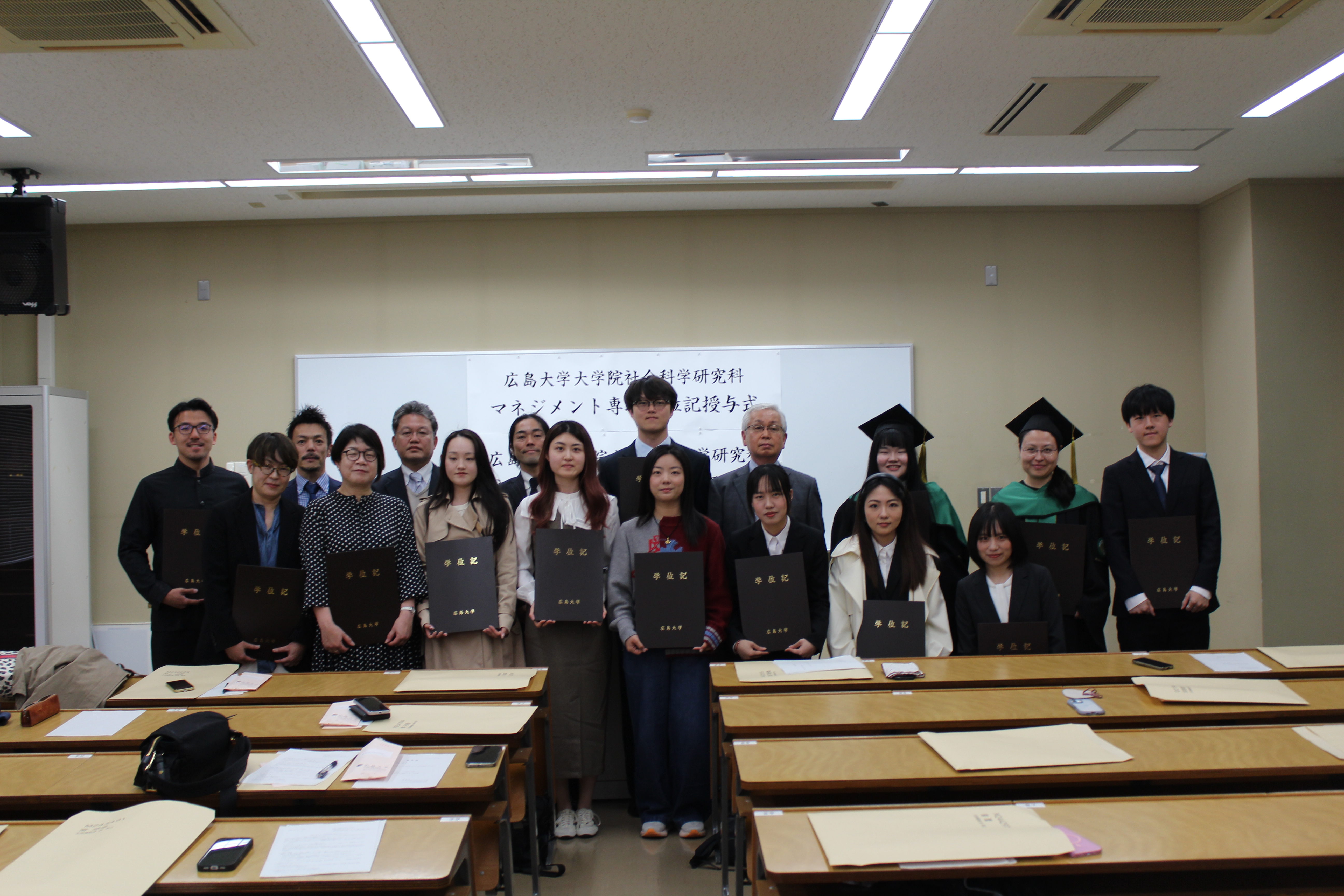 2026年3月28日(土)広島大学東千田キャンパスにおいて、2025年度マネジメント専攻・マネジメントプログラム学位記授与式が執り行われました。今後ますますのご活躍をお祈り申し上げます。