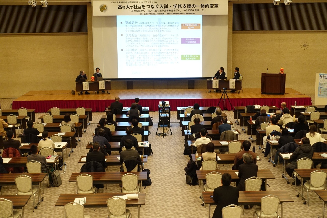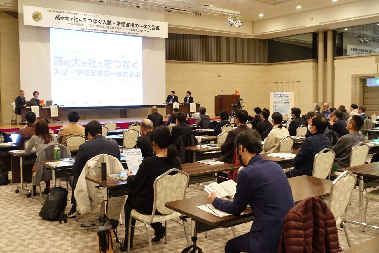 この度、本機構の目的や取り組みを紹介し、専門家とともに高等学校・大学・社会をつなぐ新たな大学教育について考えることを目的として、12月13日(土)に広島大学未来創造人材教育機構キックオフシンポジウム「高校.大学.社会をつなぐ入試・学修支援の一体的変革―高大接続から「個人に寄り添う高等教育モデル」への転換を目指して―」を開催しました。当日は、高校教員や生徒の保護者、本学・他大学の教職員、学生等を含めて、広島国際会議場での対面とオンラインを合わせて約150名の方にご参加いただきました。