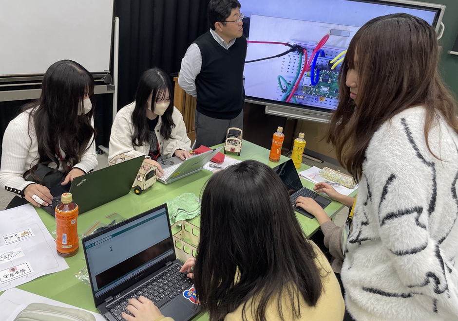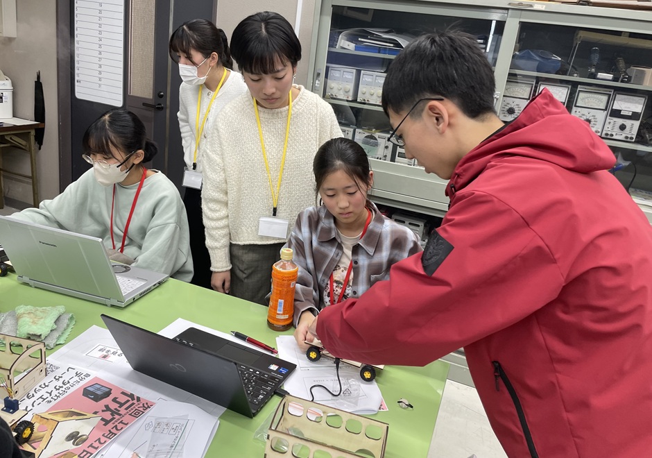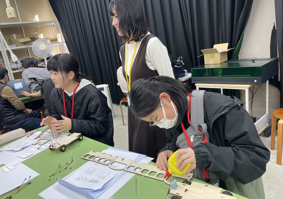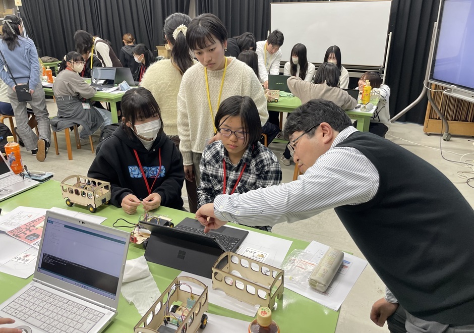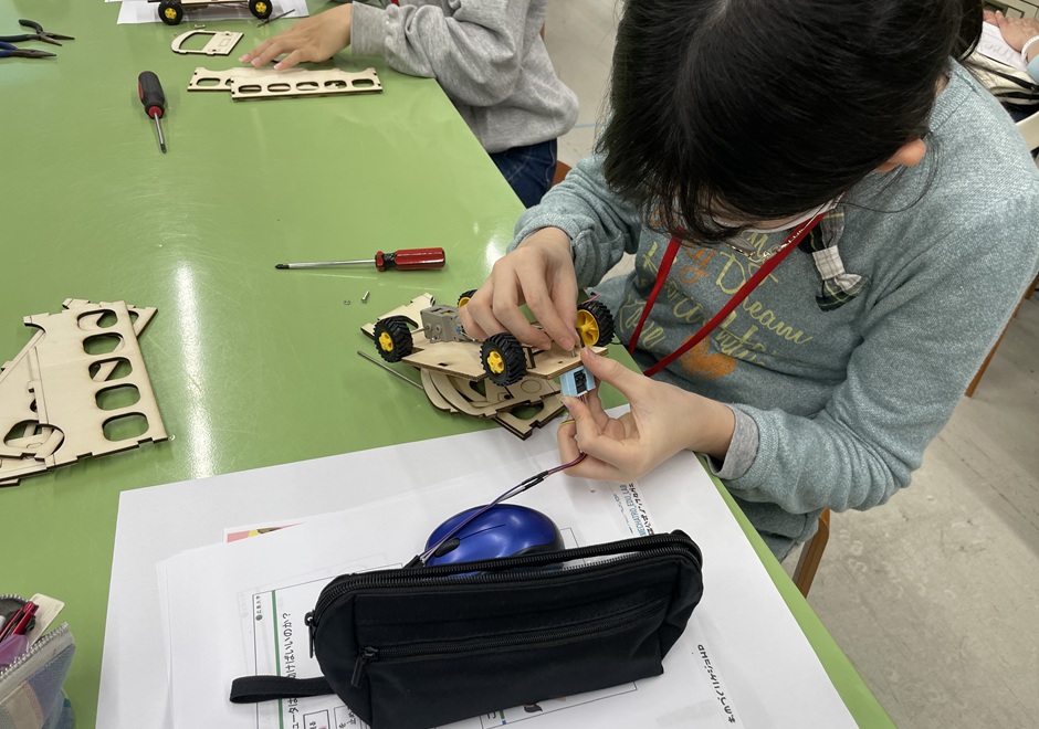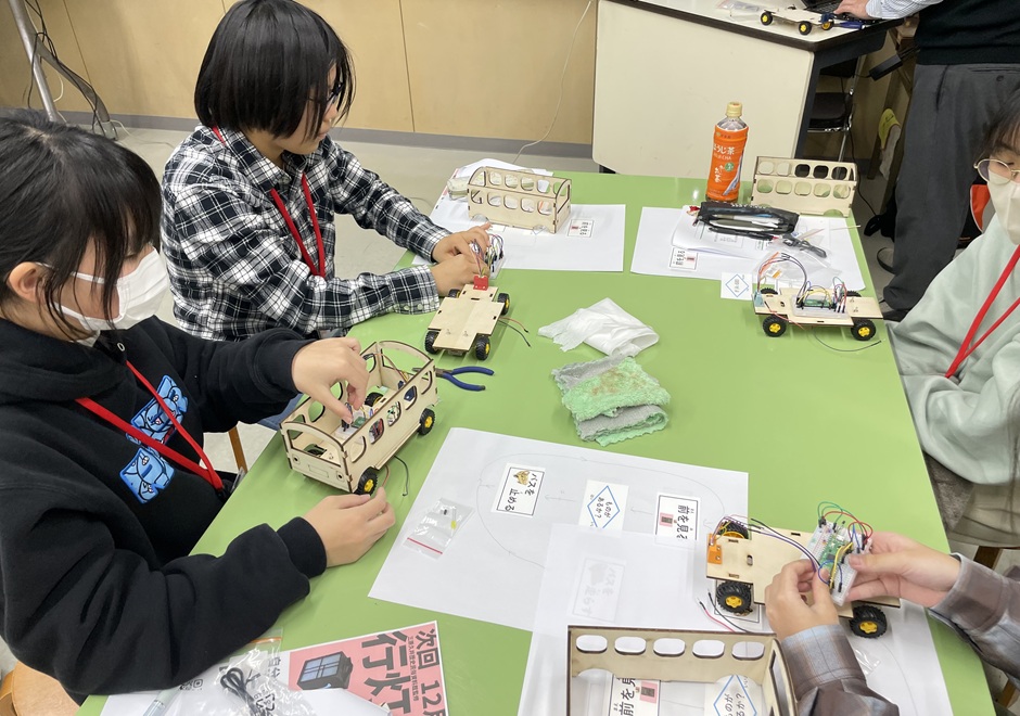 次に、実際に動かすバスの組み立てに取り組み、配線を組み込んで本体に取り付けました。組み立てが完了した後は、パソコンでプログラムを入力し、バスが自分の思い通りに動くかを確認。受講生は試行錯誤を重ねながら、調整を行っていました。