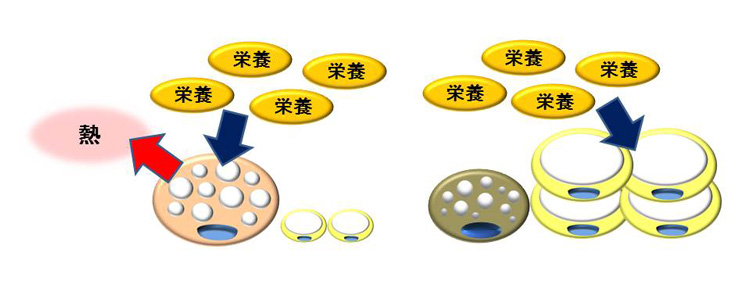 褐色脂肪細胞の働きが悪いと、余分な栄養が白色脂肪組織に蓄えられるため、白色脂肪細胞が大きくなり、細胞数も増加する。
