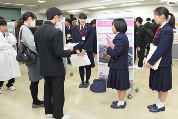 | マーメイドカフェでジャズを演奏する学生 | 理学部の中学生・高校生科学シンポジウムのポスター発表 |