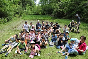 2017年5月15日(月)、理学系研究科の学生5人が、附属幼稚園の園児たち27人に、広島大学生態実験園の田んぼで田植えの方法について指導を行いました。